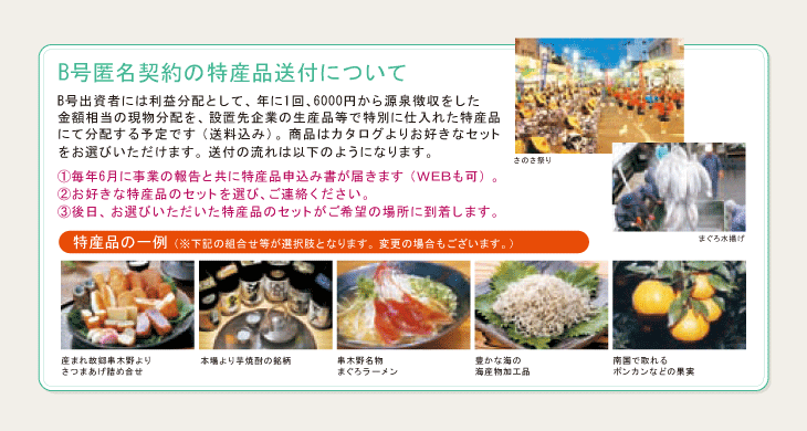 合同会社さつま自然エネルギーが、各出資者の皆さまと「匿名組合契約」を締結します。皆さまの出資をとりまとめ、これを匿名組合契約に基づき対象事業(上記参照)に投資します。事業開始後は、対象事業の収益から、匿名組合契約で定める分配ルールに従って、出資者の皆さまに現金分配および現物分配を行います。
